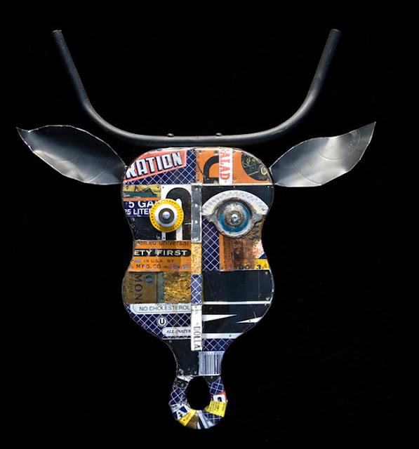 of media, from digital illustration to collage, to sculpture made of natural materials and recycled junk.